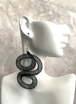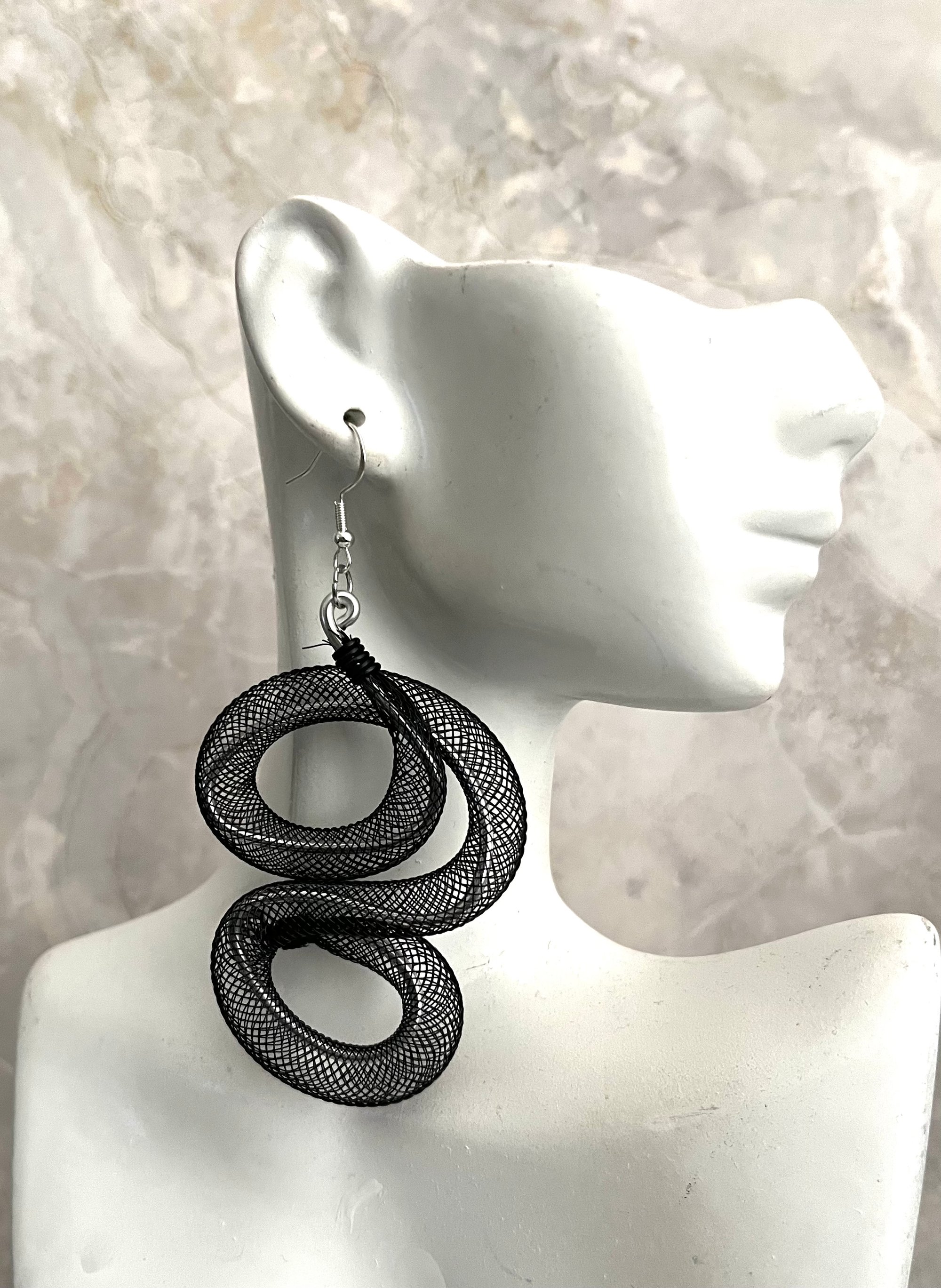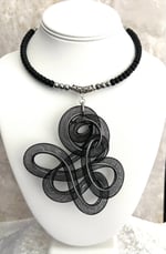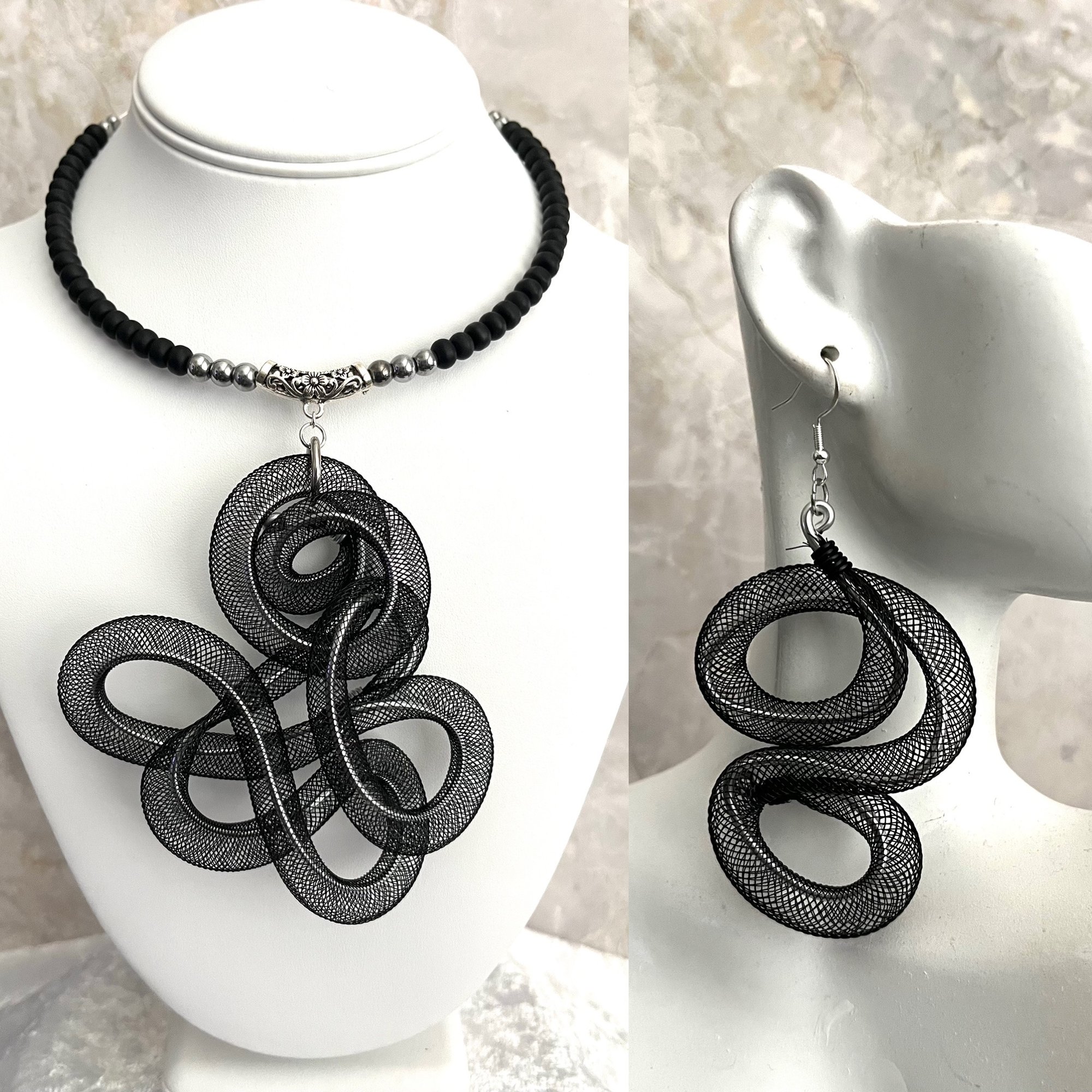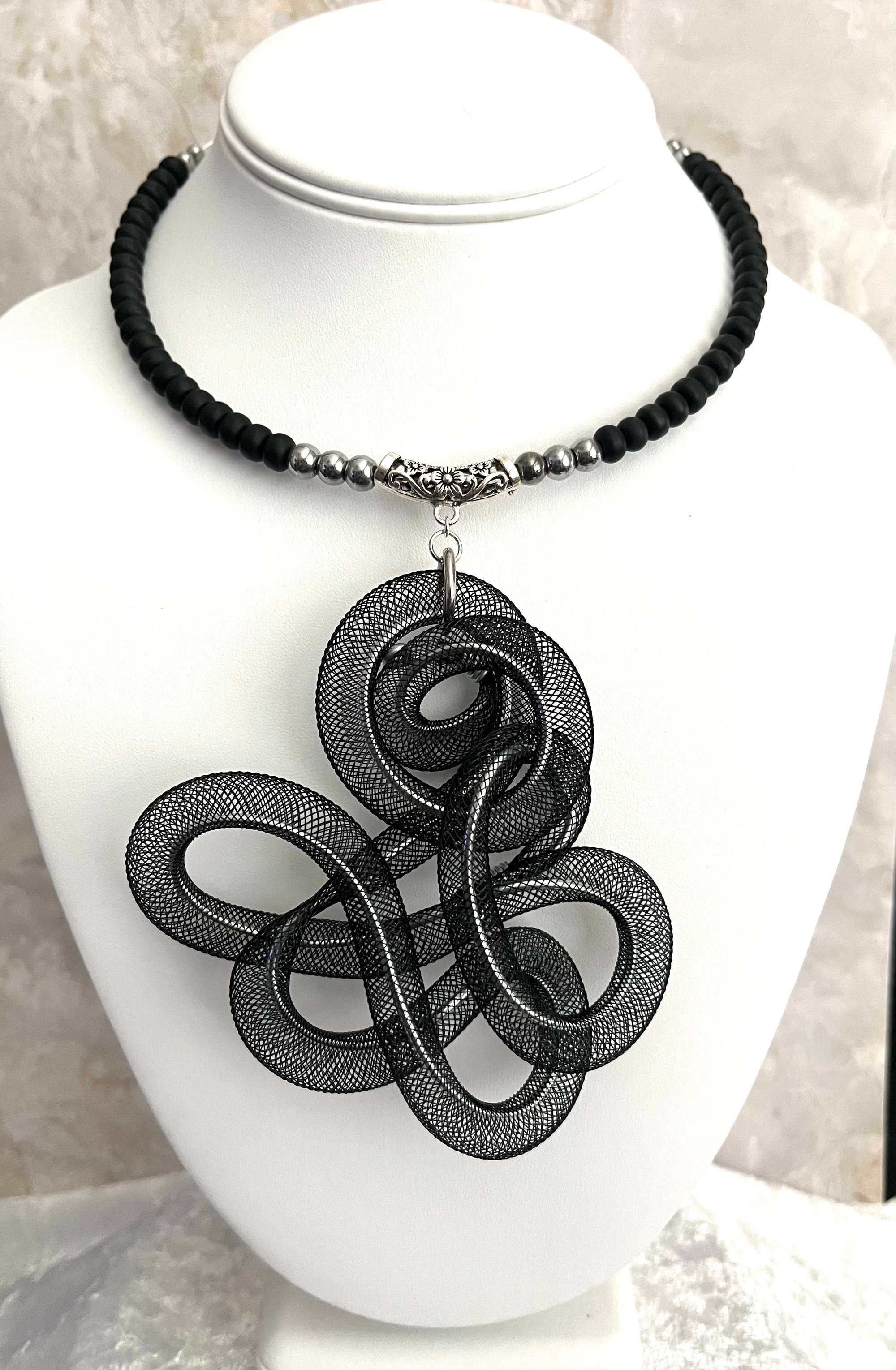 Lightweight aluminum with black mesh tubing; silver and black matte glass beads and metal accents