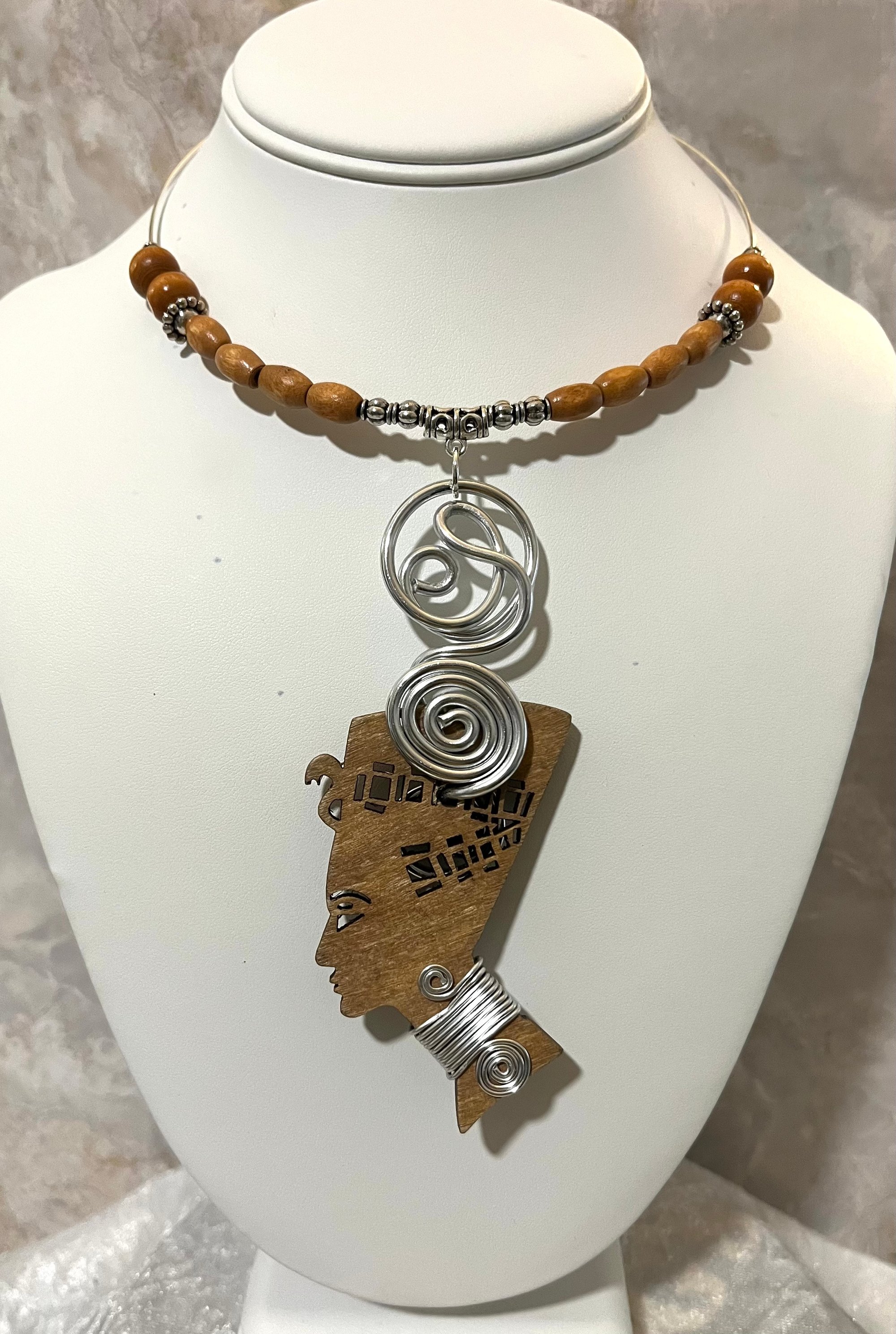 Wooden beads & pendant; aluminum on memory wire choker