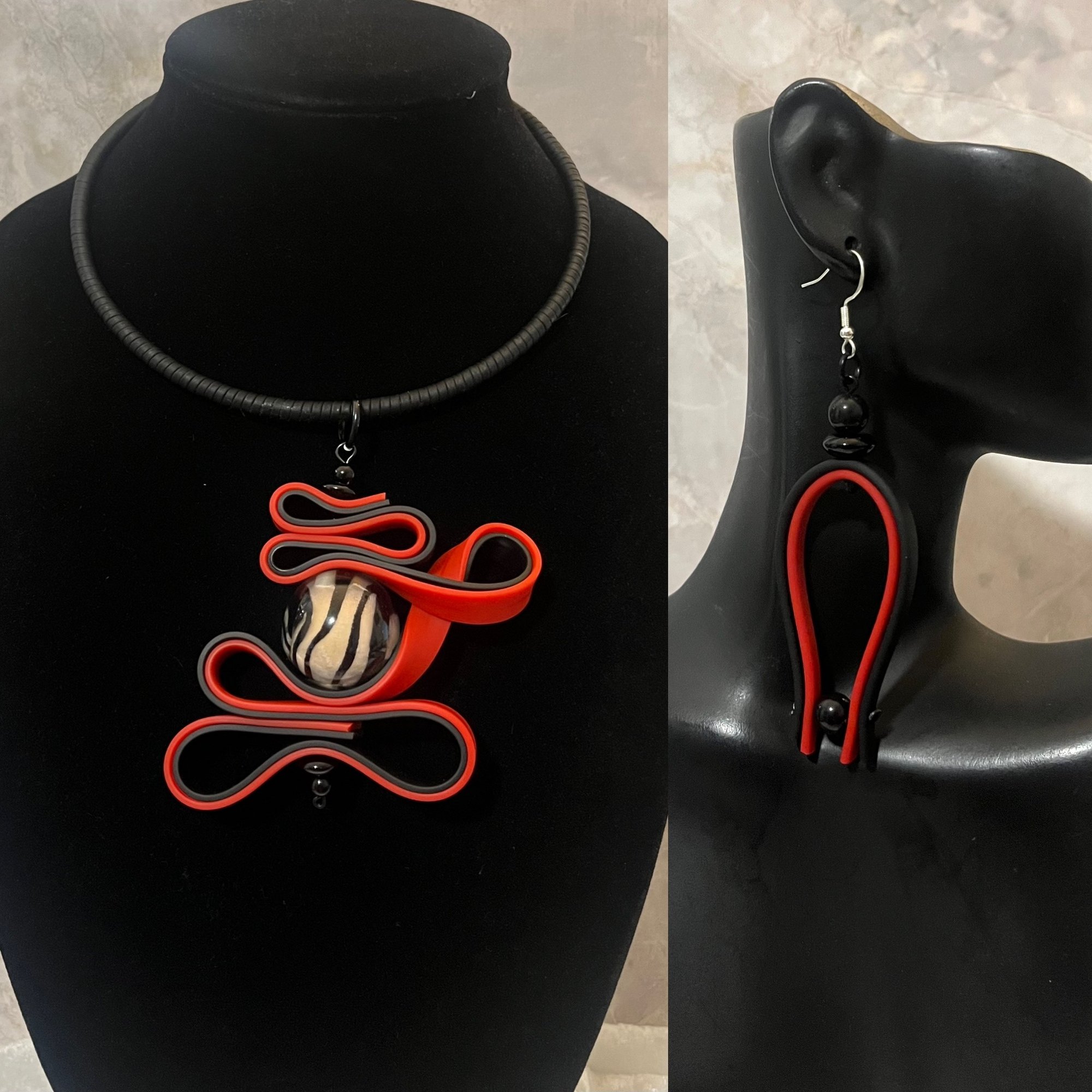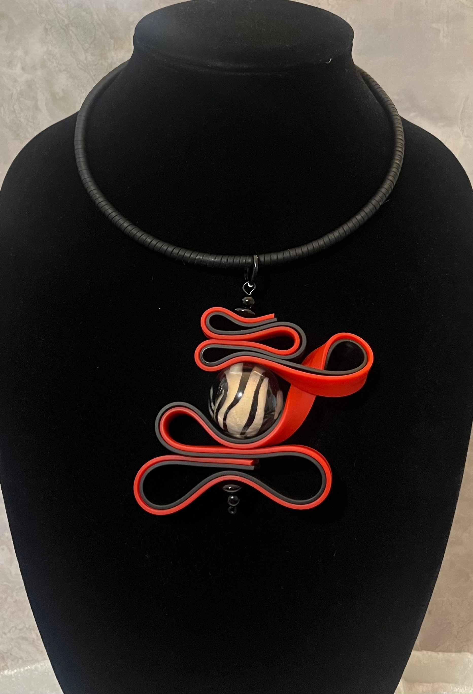 Black & red polymer, black glass beads, glass stripped bead