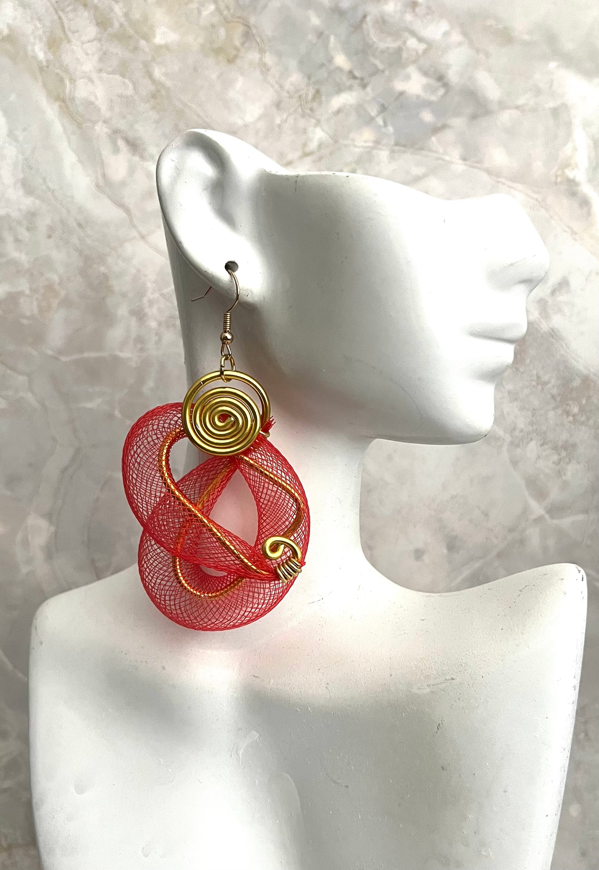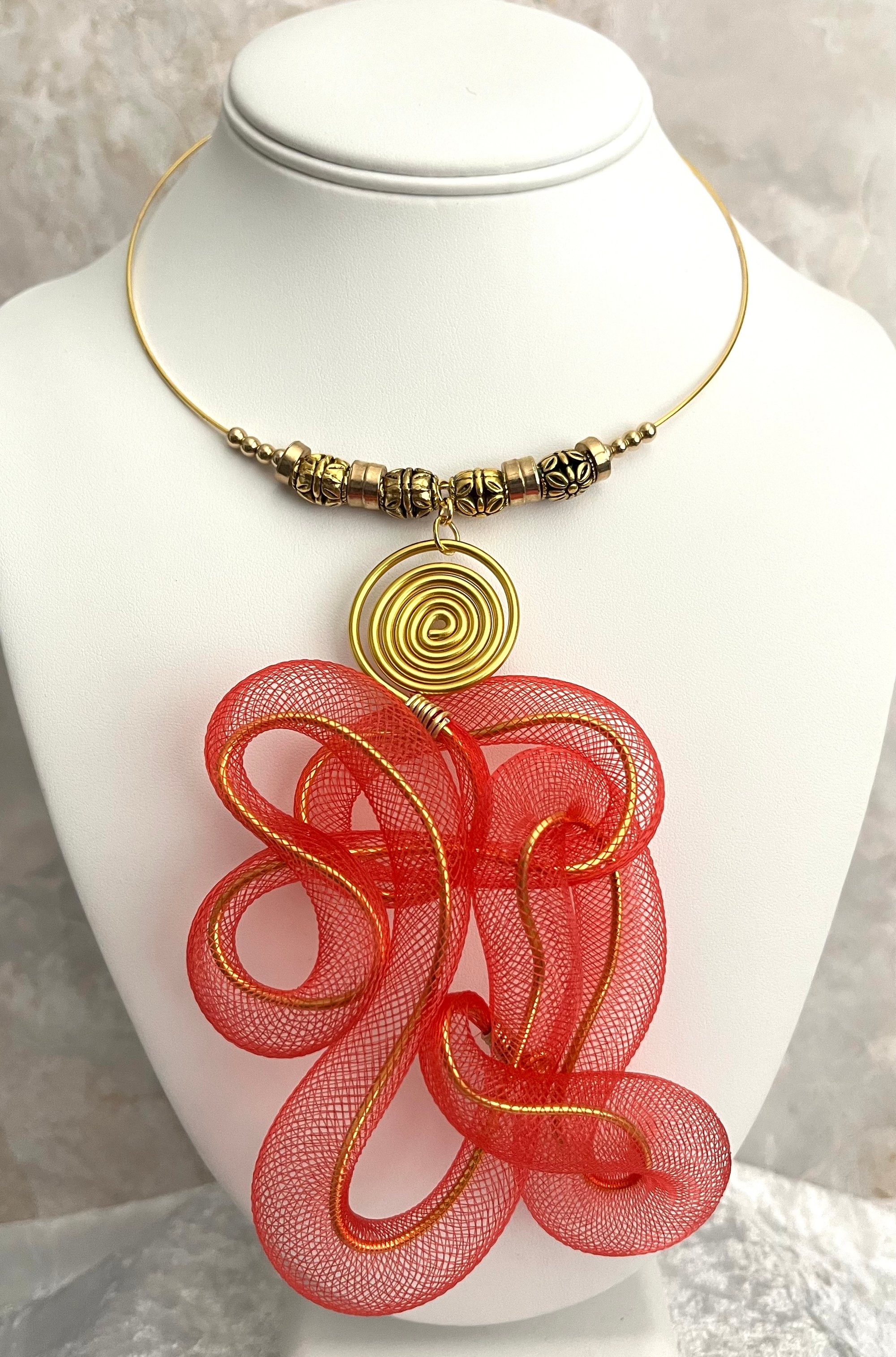 Lightweight gold tone aluminum with red mesh tubing; gold metal accents