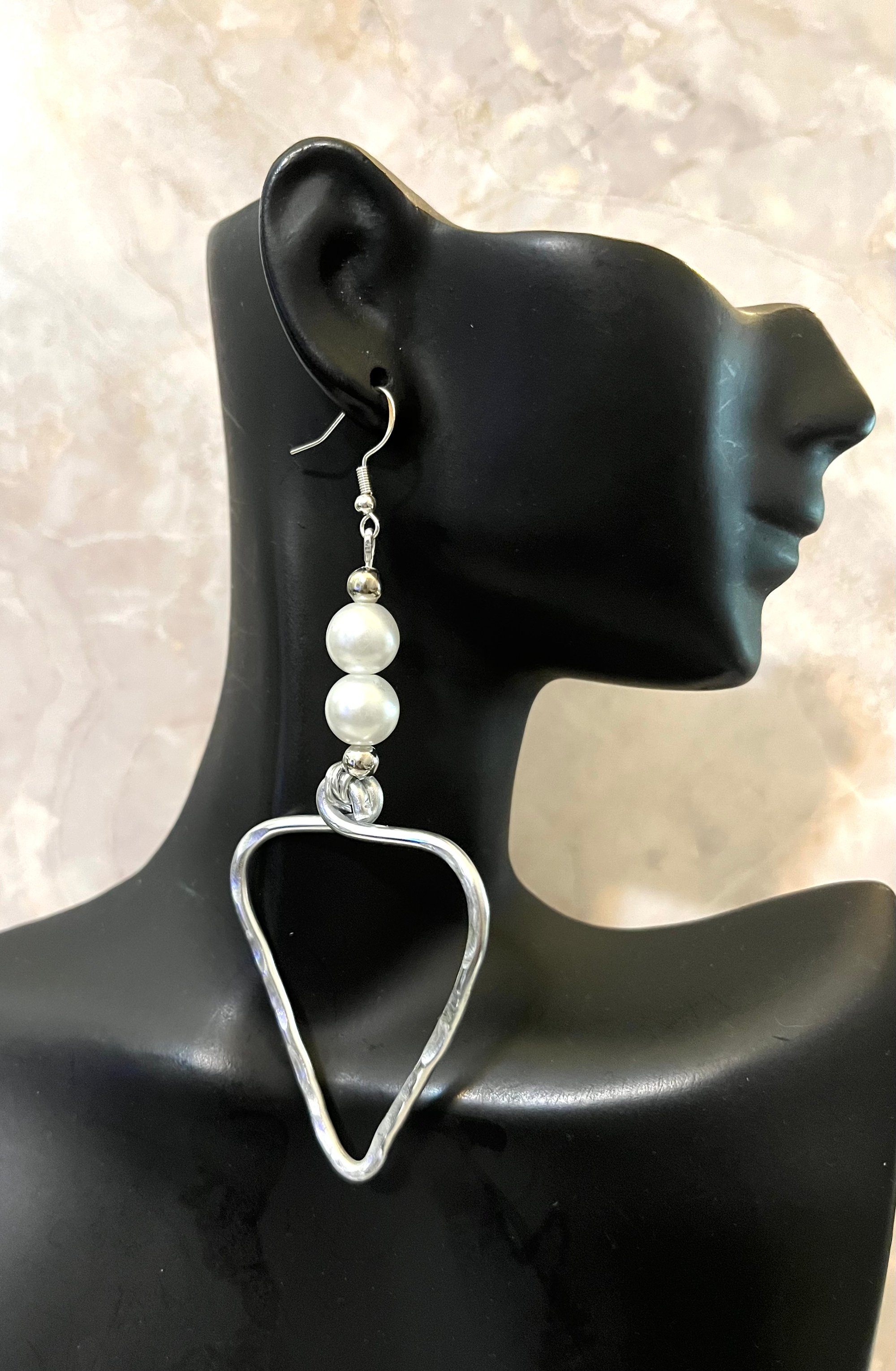Faux pearl beads; textured aluminum heart