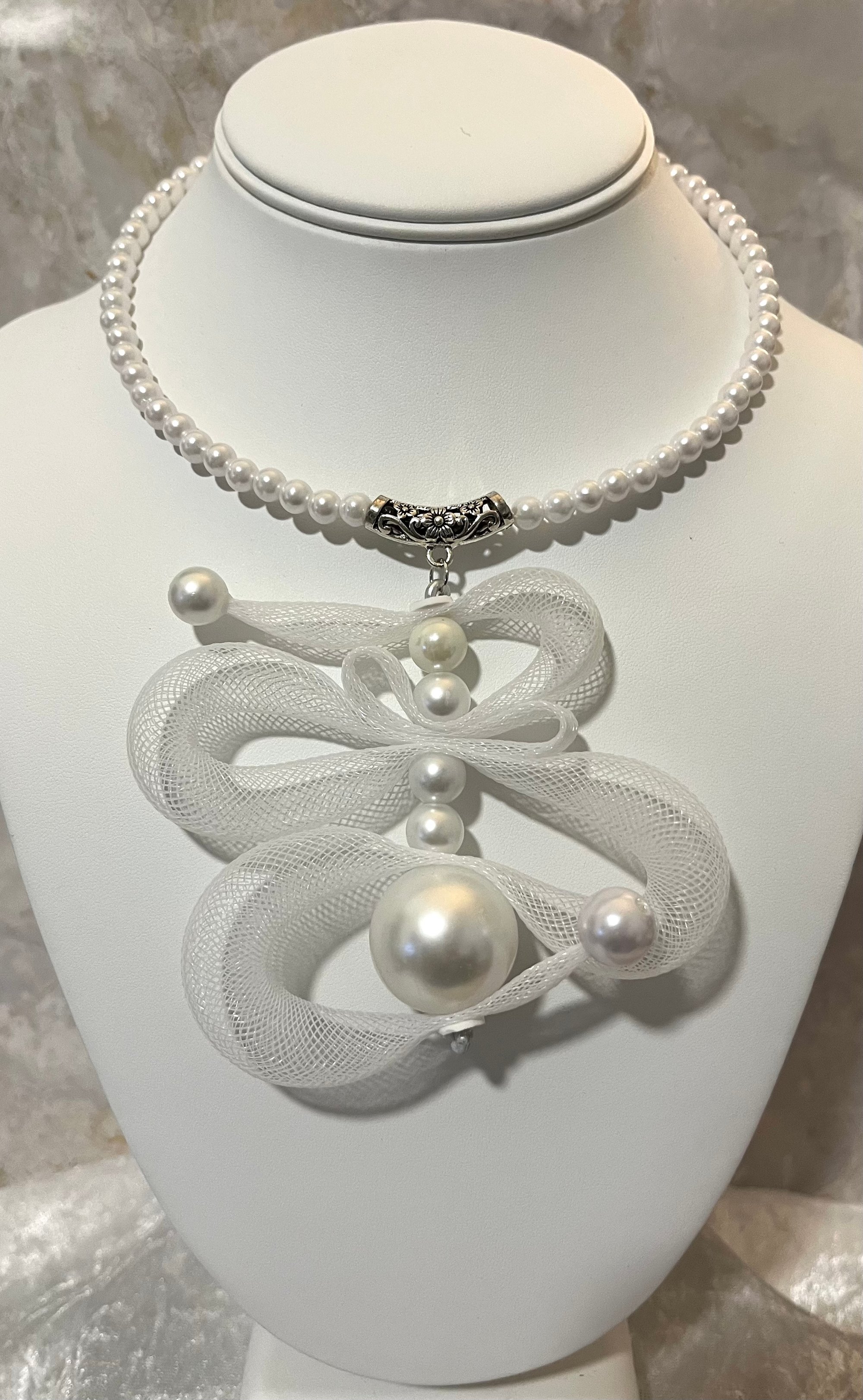 Lightweight aluminum with white mesh tubing; faux pearl beads